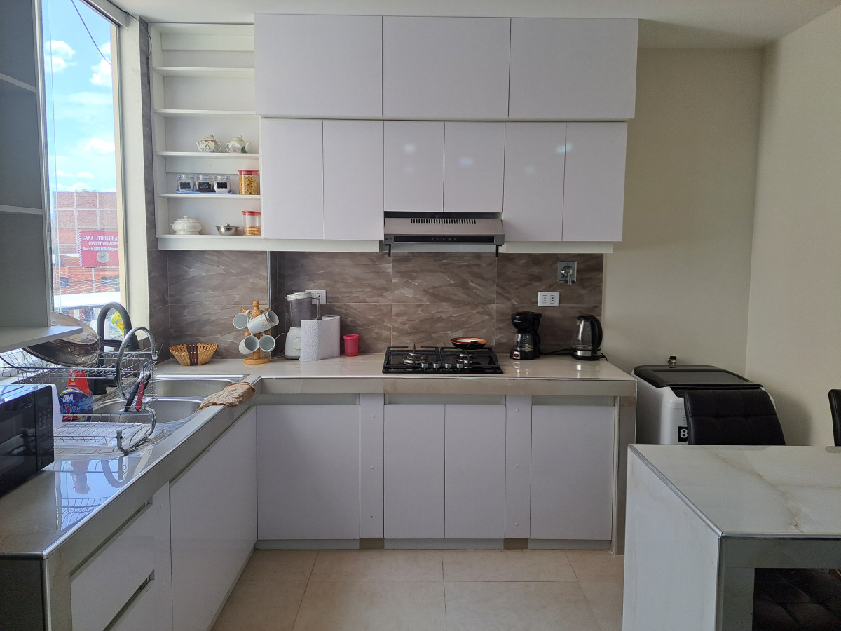 Cómodo departamento equipado, a solo 12 km del centro de la ciudad, cerca a avenida concurrida con restaurantes, farmacias, centros de diversion, zona de la terminal de buses